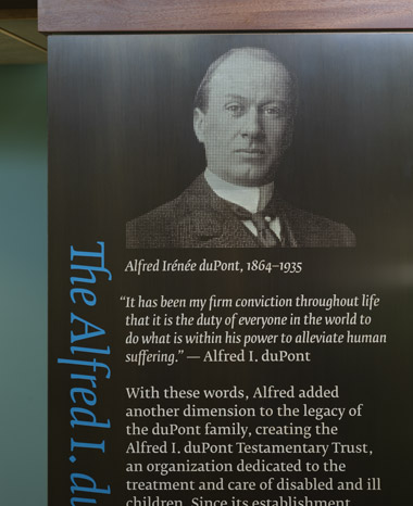 Visitor center Wilmington, Delaware Alfred Irénée duPont built Nemours in 1909, and named the estate after the town in France that his great great grandfather, Pierre Samuel duPont, represented at the Estates General in 1789. Recently completed at the entrance of the 222 acres property, the visitor center was designed to house a timeline and a documentary film introducing the visitors to Alfred’s life and legacy before they complete the tour experience of the five-story mansion and the beautiful French gardens. An early collaboration with the architect and the institution has allowed to develop the content and design into very well crafted exhibits and signage that are totally embedded into the architecture. The graphic language unifies the whole experience and was developed not solely for the exhibits but the film opening title and credits, the interior and exterior signage, the garden interpretation signs and a 28-page book containing the entire content of the exhibits. (Project realized while at C&G Partners) Alfred Irénée duPont construisit Nemours en 1909, et nomma le domaine d’après la ville française homonyme que son arrière arrière grand père, Pierre Samuel duPont, représenta à l’assemblée des États Généraux de 1789. Récemment construit aux portes du domaine de 90 hectares, le centre d’accueil des visiteurs a été réalisé pour accueillir une frise chronologique et un film documentaire familiarisant les visiteurs avec les moments clés de la vie d’Alfred.